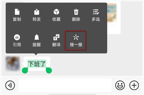 全量上線后,用戶可以在對(duì)話框中長(zhǎng)按選擇文本,彈出的導(dǎo)航欄中的最后一個(gè)功能為“搜一搜”。