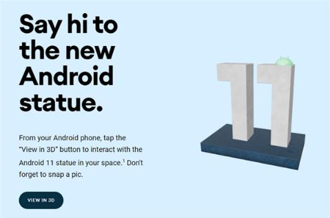 目前,谷歌在其官網上線了 Android 11 的 3D AR 雕像,可以讓用戶更好的去新上這個新版系統,同時位于加利福尼亞州的谷歌山景城總部,也已經樹立了安卓 11 的實體雕像,雖然沒有了許多人熟悉的甜點代號造型(只有純數字 11),但綠色小機器人在 AR 頁面上還是表現得相當活躍。