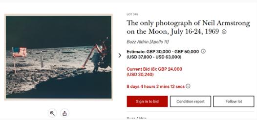 此次拍賣的亮點(diǎn)是一張阿姆斯特朗站在月球表面的照片,該照片由巴茲·奧爾德林(Buzz Aldrin)拍攝,拍賣預(yù)售估價(jià)在 37800 美元(約合人民幣 25 萬)到 63000 美元(約合人民幣 42 萬)。