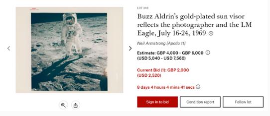 此外,作為第二個(gè)登陸月球的人,奧爾德林的一張照也將在此次拍賣,拍賣預(yù)售估價(jià)在 5040 美元(約合人民幣 3.3 萬元)到 7560 美元(約合人民幣 5 萬元)。