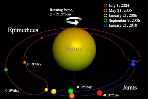 馬蹄形軌道聽起來完全不可能。然而雷蒙德指出,土星的衛星土衛十和土衛十一就是在距離土星約 93000 英里(15 萬公里)的馬蹄形軌道上運行,兩顆衛星的運行軌道就在土星環之外。兩顆衛星之間最近的距離大約是 9300 英里(15000 公里)。可以想象一下,當一對位于太陽系宜居帶中地球大小的行星共同圍繞太陽運行時,各自的馬蹄形軌道會是什么樣子。所謂的宜居帶指在圍繞恒星的區域中,溫度適宜,足以讓液態水在行星表面上存在。