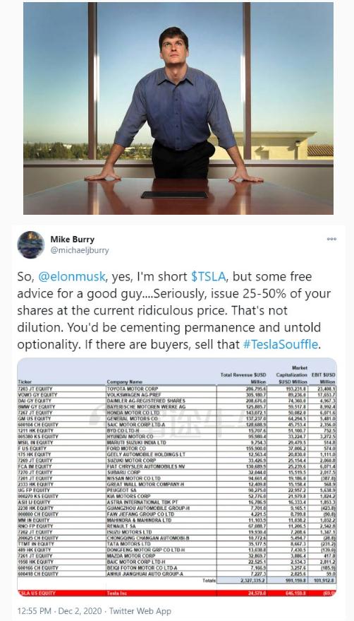 12 月 2 日消息,《大空頭》原型 Micheal Burry 今日在社交平臺(tái)上發(fā)布推文并@特斯拉 CEO 馬斯克(Elon Musk),表示自己正在做空特斯拉(TSLA.US)。此前,Micheal Burry 認(rèn)為特斯拉的估值與業(yè)內(nèi)其他公司相比是荒謬的,他發(fā)布了一張截圖,顯示了特斯拉與其競爭對手的估值。