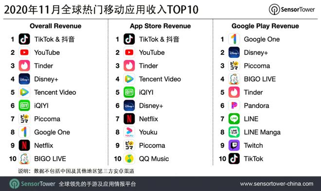 營(yíng)收榜第二至五名分別為 YouTube,美國(guó)約會(huì)軟件 Tinder,流媒體平臺(tái) Disney+ 和騰訊視頻。