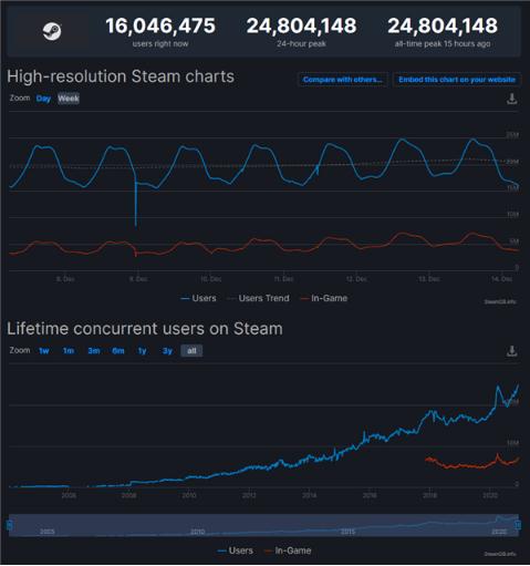 Steam 平臺今天創下了一個新的紀錄,同時在線玩家最高達到 24804148 人,打破了今年 4 月份疫情期間創造的 24535923 人,而自從今年 3 月以來,Steam 平臺同時在線玩家數就一直穩定在 2000 萬人以上。