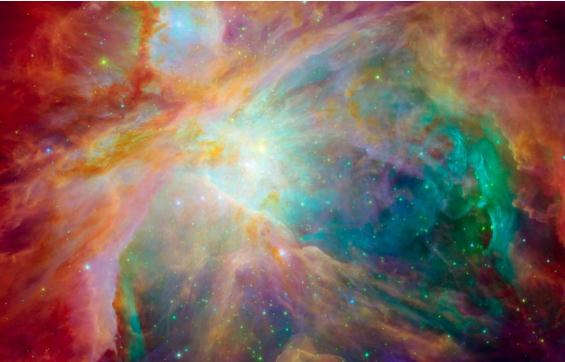 哈勃和斯皮策太空望遠鏡中展示的各種顏色,可理解成氫、硫、碳混合而成的氣旋,正在距離我們 1500 光年之外的“恒星工廠”中孕育一批新生的恒星。