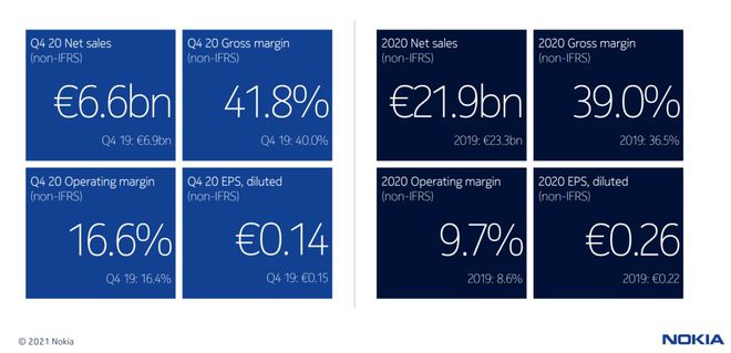 諾基亞日前正式公布 2020 年第四季度以及全年財報。數據顯示,諾基亞第四季度凈銷售額 65.68 億歐元,同比下降5%;全年凈銷售額 219 億歐元,同比下降6%。