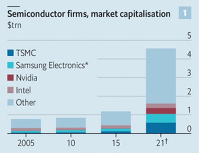 圖 1 膨脹的全球半導體產業市值。截圖自《經濟學人》,數據來源:彭博社;麥肯錫咨詢公司;經濟學人(下同)