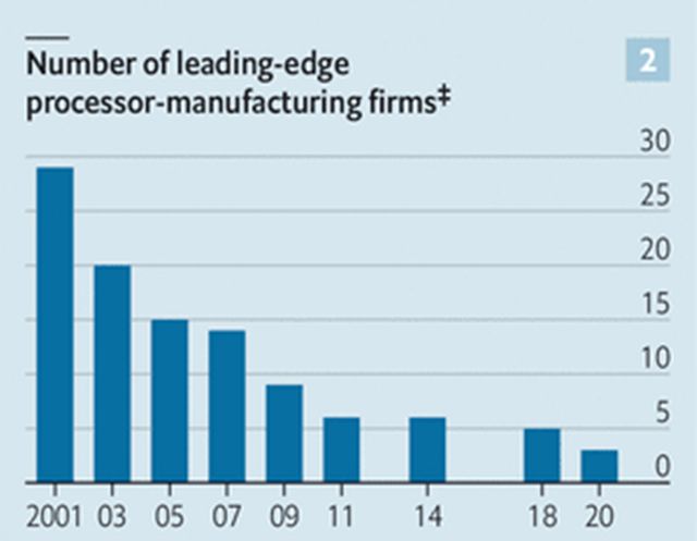 如果不是因為在產業鏈另一端——那些將設計轉化為蝕刻在硅片上的電子電路的芯片工廠正在發生的事情,這一切對每個人來說都應該是好消息。追趕技術發展導致的成本不斷膨脹,意味著芯片設計雖然百家爭鳴,具有實際生產能力的芯片制造企業數量卻在不斷萎縮(見圖2)。世界上只有三家公司能夠制造高端處理器:英特爾、臺積電和韓國三星。美國半導體工業協會估計,目前全球 80% 的芯片制造產能在亞洲。