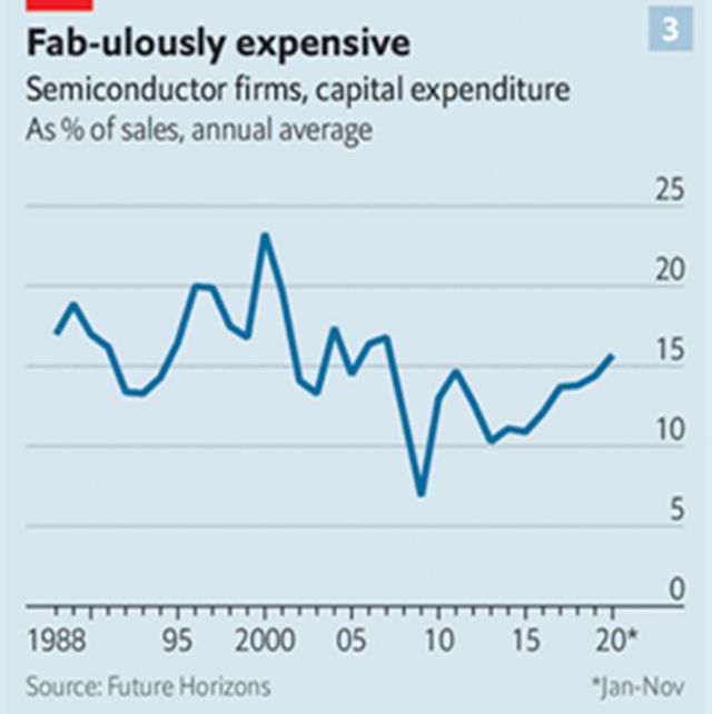 圖 3 芯片行業資本支出在下降過后,再度開始回升。截圖自《經濟學人》數據來源:Future Horizons