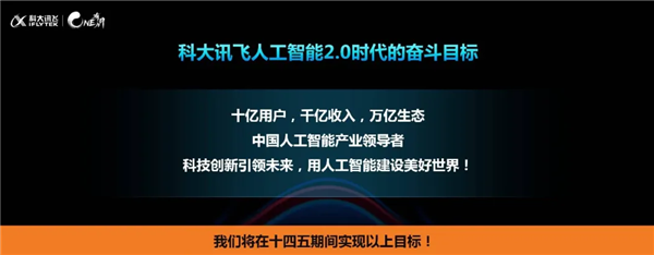 今天,科大訊飛發布人工智能 2.0 時代的奮斗目標:十億用戶,千億收入,萬億生態。