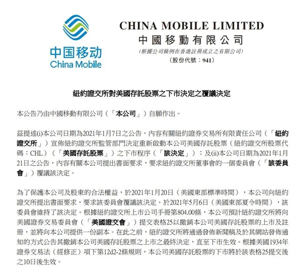 5月7日晚間,三大運營商紛紛公告,紐約證交所委員會維持了紐約證交所監(jiān)管部門重新啟動本公司美國存托證券ADR下市程序的決定,預計紐約證交所將向美國證券交易委員會提交25表格以撤銷本公司美國存托證券的上市及注冊(退市)。
