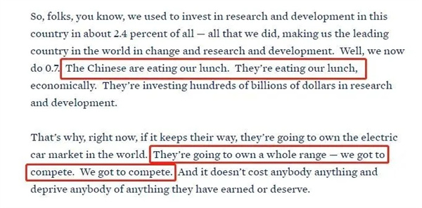 白宮官網發(fā)布的的演講稿顯示,在演講一開始,拜登就強調投資基礎設施的重要性,并聲稱這是一個“千載難逢的機會”,將重建一個公平、有彈性和有競爭力的經濟。
