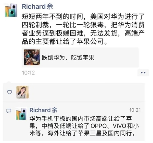 4月30日,余承東在朋友圈分享了虎嗅標(biāo)題為《跌倒華為,吃飽蘋果》的文章,并附言痛斥美國(guó)對(duì)于華為的制裁和打壓,讓蘋果坐收漁利。