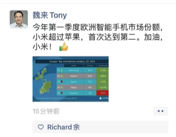 5月6日,canalys發(fā)布了2021Q1全球智能手機(jī)市場(chǎng)的調(diào)研報(bào)告,小米成功躋身歐洲市場(chǎng)第二,余承東在小米集團(tuán)總辦主任魏來(lái)的朋友圈下面,點(diǎn)了個(gè)贊。