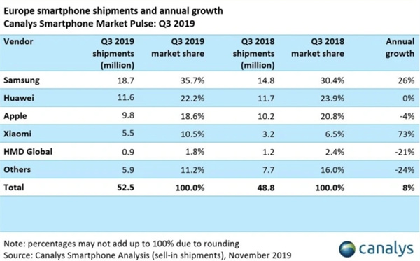 根據(jù)canalys公開的報(bào)告顯示,華為曾經(jīng)在2019年第三季度拿下了歐洲市場(chǎng)22.2%的新機(jī)出貨量市場(chǎng)份額,而同樣深耕歐洲市場(chǎng)多年的小米,當(dāng)季的新機(jī)市場(chǎng)份額只有10.5%。