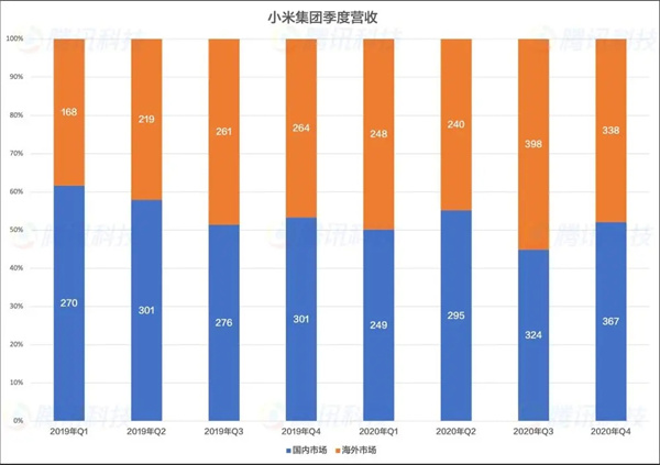 2020年第三季度,小米迎來(lái)了歷史上最好的一季財(cái)報(bào),海外市場(chǎng)的營(yíng)收大幅度增長(zhǎng),首次超越了國(guó)內(nèi)市場(chǎng),盡管到了Q4有所下滑,但整體的營(yíng)收也要比之前提升了30%左右。