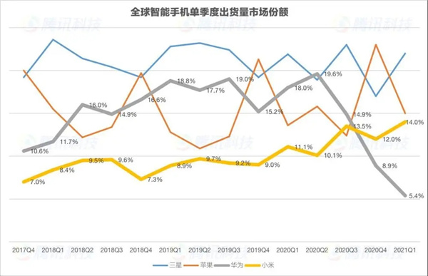 在華為的智能手機(jī)業(yè)務(wù)受阻之后,小米也在全球智能手機(jī)出貨量上穩(wěn)步提升。在canalys給出的全球智能手機(jī)單季出貨量的市場(chǎng)報(bào)告中,小米在最近兩年穩(wěn)步提升,尤其是在2019年之后,其整體的份額都能穩(wěn)定在10%以上,最新一季更是達(dá)到了14%。