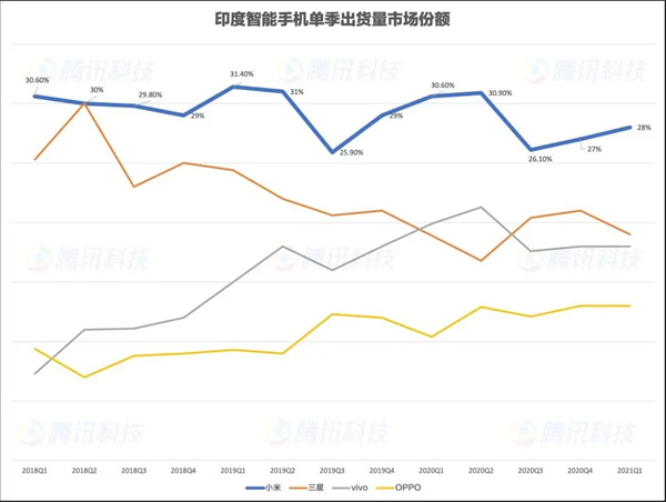 小米智能手機(jī)市場(chǎng)份額的穩(wěn)步提升,歐洲市場(chǎng)貢獻(xiàn)頗多,而另外一個(gè)海外市場(chǎng)也不容忽視,那就是如今飽受疫情困擾的印度。
