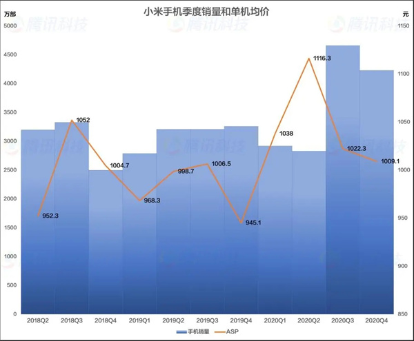 小米的財(cái)報(bào)中關(guān)于手機(jī)單價(jià)的披露信息中,小米從2018年Q2到2020年Q4的整機(jī)均價(jià)只上漲了50元左右,而ASP依然維持在1000元左右的區(qū)間。這意味著小米智能手機(jī)在過(guò)去幾年盡管一直想要發(fā)力高端市場(chǎng),但出貨量大的主力機(jī)型,依然是中低端產(chǎn)品。