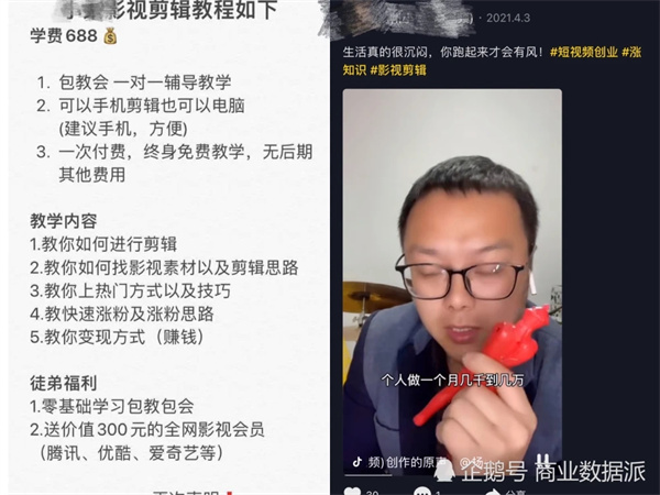 什么是“收徒”?這是指那些已經有一定視頻剪輯成績和粉絲量的博主,通過抖音個人簡介、直播等形式,面向粉絲群體收徒,以有償傳授視頻剪輯、賬號運作、粉絲管理甚至逃避審查的技巧的方式進行小范圍內的流量變現。有些博主甚至根據不同的需求制定了不同的套餐,價格從99到上千元不等,并借此大賺一筆。
