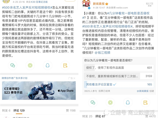 4月26日,新聞晨報發布微博調查“你認為幾分鐘看完一部電影是否侵權?”,在參與投票的3919人中,有3153人認為這種做法“不侵權”,屬于二次創作。而大眾的評論大致圍繞“快節奏剪輯幫助注水劇集精簡”、“觀眾節約時間”、“剪輯幫助宣傳劇集”等論點表述,更有甚者認為長視頻平臺抵制視頻剪輯的行為屬于“得了便宜還賣乖”。