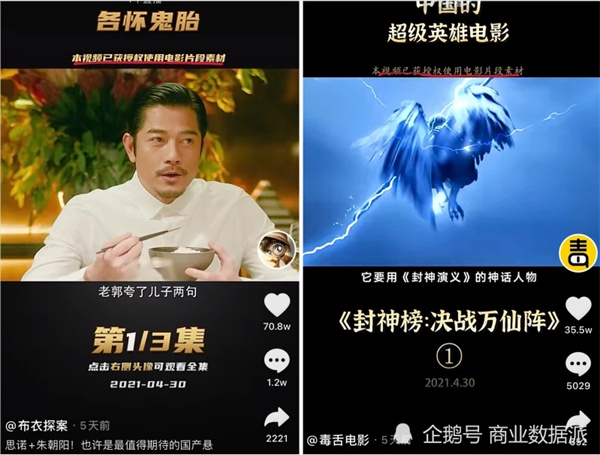 不過,隨著事件的發酵,《商業數據派》已經注意到一些變化,抖音上的影視頭部博主,千萬粉絲大號“毒舌電影”和“布衣探案”均在近期發布的作品中,標明“本視頻已獲授權使用電影片段素材”。