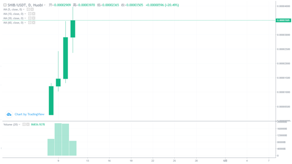 過去短短兩三個月,SHIB(俗稱SHIB)的漲幅已經超萬倍,繼狗狗幣后再成“傳奇”。5月11日,在大多數數字貨幣走跌的行情下,SHIB價格依然堅挺,最高漲超30%。截止5月11日18:30,SHIB在火幣全球站的報價為0.00003454USDT(尾數價為3454)。