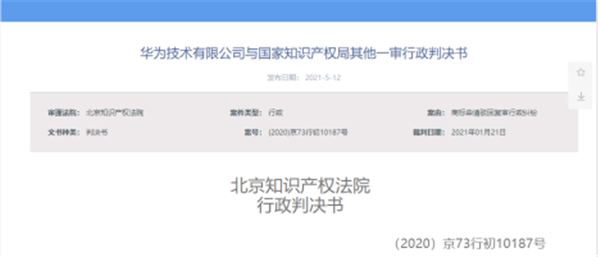 5月12日,北京法院審判信息網公布華為技術有限公司與國家知識產權局其他一審行政判決書,判決結果為駁回原告華為技術有限公司的訴訟請求。