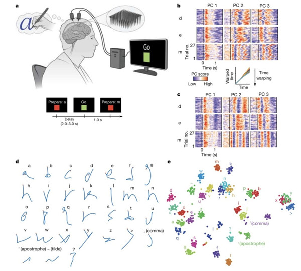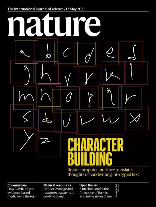 北京時間5月12日晚間,頂級學術期刊《自然》(Nature)以封面文章的形式刊發了由斯坦福大學、布朗大學、哈佛醫學院等團隊的研究人員聯合完成的一項里程碑式研究,題為“High-performance brain-to-text communication via handwriting”。該研究回歸到古老的表達自方式——手寫,首次解碼了與書寫有關的神經信號,并實時顯示它們。