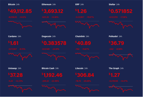 彼時比特幣閃崩也帶動加密貨幣集體大跌。在比特幣跌破5萬美元關口時,瑞波幣跌幅逾15%,以太坊跌超9%至2253美元附近。在比特幣日內暴跌15%時,以太坊暴跌20%,幣安幣暴跌17%,瑞波幣暴跌26%,狗狗幣暴跌19%,萊特幣暴跌28%。