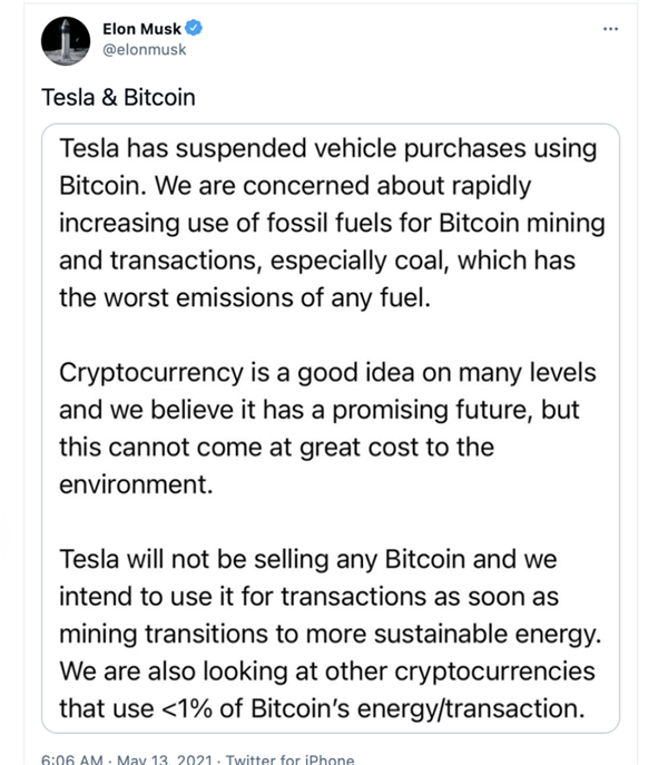 北京時間5月13日,特斯拉CEO埃隆 馬斯克發推文稱:“特斯拉暫停使用比特幣來支付購車費用,正在考慮使用能源消耗更低的加密貨幣。我們對比特幣挖礦和交易中使用化石燃料頻率的迅速增加感到擔憂。”
