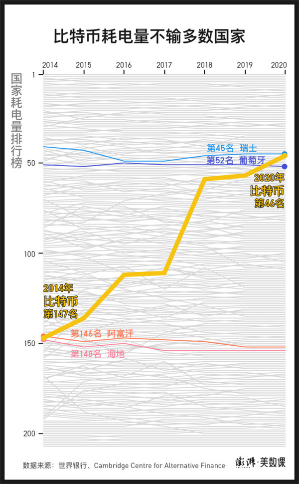 如果把比特幣視作一個國家,它將位列全球耗電量最大的前 30 國之一。根據劍橋大學替代金融研究中心的研究,截至 2021 年 5 月 10 日,全球比特幣挖礦的年耗電量大約是 149.37 太瓦時(1 太瓦時為 10 億度電),這一數字已經超過馬來西亞、烏克蘭、瑞典的耗電量,已十分接近耗電排名第 25 名的越南。