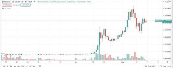 不過,轉天他又再次示好狗狗幣,稱正與其開發(fā)人員合作以提高交易效率,狗狗幣大幅反彈。截至北京時間5月16日13:00,從5月初崩盤后的最低點0.38美元附近飆升至0.53美元。