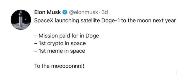 嘗到甜頭的馬斯克,又將目光投向名不見經傳的狗狗幣身上。狗狗幣一年多上漲200倍后,馬斯克宣布將用狗狗幣融資的錢,在明年發(fā)射月球衛(wèi)星。