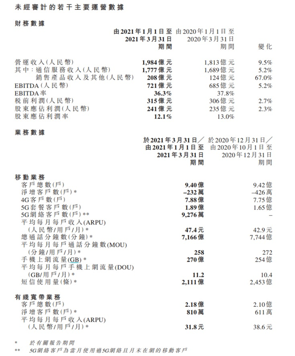 財務數(shù)據(jù)顯示,一季度,中國移動營運收入為1984億元,比上年同期增長9.5%。其中,通信服務收入為1777億元,比上年同期上升5.2%。股東應占利潤為241億元,比上年同期上升2.3%。