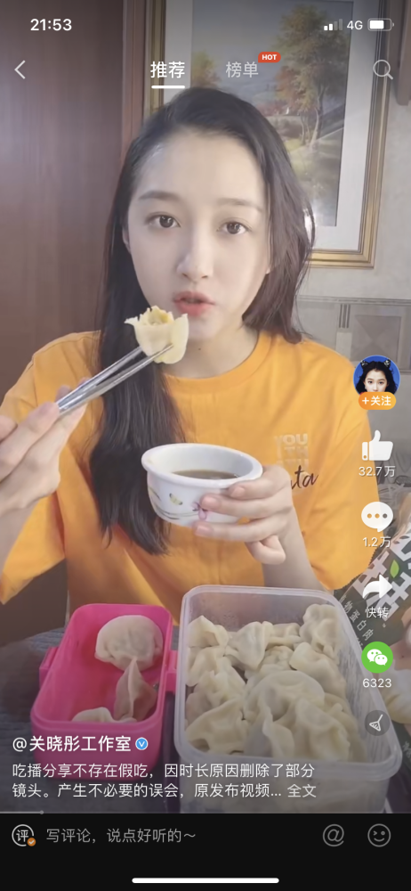 近日,話題#關曉彤 植物肉#登上熱搜,焦點主要是關曉彤在分享吃植物肉餃子的視頻時,由于只有咀嚼沒有吞咽的動作,被網友質疑是假吃。隨后,#關曉彤工作室否認吃播假吃#再度登上熱搜。