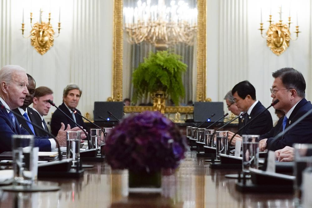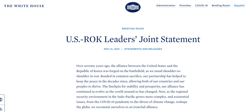 正在美國訪問的韓國總統文在寅當地時間21日在白宮與美國總統拜登舉行會談,雙方就朝鮮半島局勢、雙邊合作及韓美同盟等交換意見,并發表了聯合聲明。根據白宮網站發布消息,這份聯合聲明果不其然提到了臺海和南海。