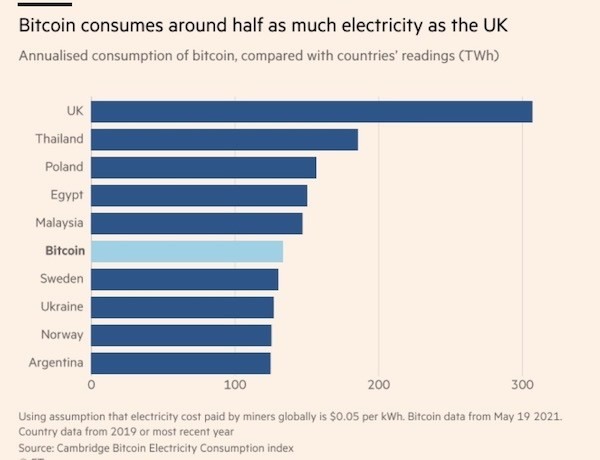 近期,英國《金融時報》發表了題為“骯臟的貨幣:日益突出的比特幣能耗問題”的專題文章。文中提及,劍橋大學比特幣耗電量指數(Bitcoin Electricity Consumption index)的最新計算似乎表明,比特幣挖礦每年耗電量為133.68太瓦時——這一基于最佳猜測的估算數字在過去5年里不斷上升。這使得比特幣的耗電量略高于瑞典(2020年用電量為131.8太瓦時),同時僅次于馬來西亞(147.21太瓦時)。