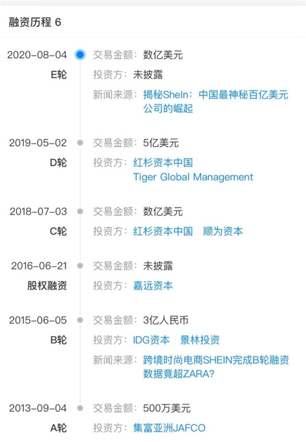 創立至今,SheIn經歷至少5輪融資。根據天眼查APP,SheIn的第一輪融資發生在2013年,投資方集富亞洲JAFCO注資了500萬美元。在隨后的幾年里,SheIn幾乎保持著一年一輪融資的節奏。