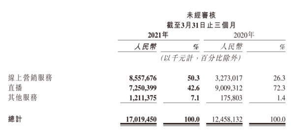 2021年第一季度在線(xiàn)營(yíng)銷(xiāo)服務(wù)的收入同比增長(zhǎng)161.5%至人民幣86億元,同時(shí),繼上一季度廣告收入超過(guò)直播收入后,這一季度,廣告對(duì)總收入的貢獻(xiàn)首次超過(guò)50%。