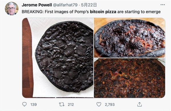 諷刺賬號“鮑威爾”在比特幣披薩節當天的諷刺推文:幣圈大佬Pomp做的比薩長這樣