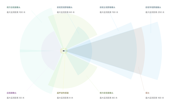 其中,前視攝像頭采用三目配置,主攝像頭能夠覆蓋大多交通場景,探測距離達到150米。前視寬視野攝像頭擁有120度魚眼鏡頭,能夠拍攝交通信號燈、距離較近的障礙物,最大探測距離為60米。前視窄視野攝像頭用于拍攝遠距離物體,適用于高速場景,最大探測距離為250米。