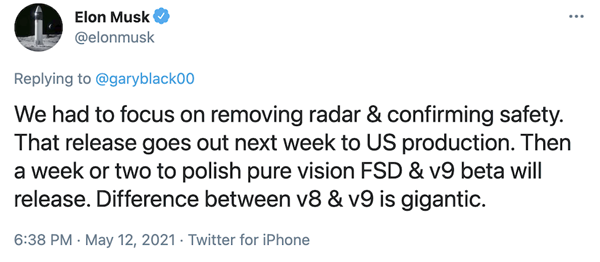 這與馬斯克社交賬號上發表的內容一致。當時他宣布,即將開始生產不帶毫米波雷達的特斯拉車型。他還宣布,純視覺感知的FSD以及FSD beta也會在近期推送。