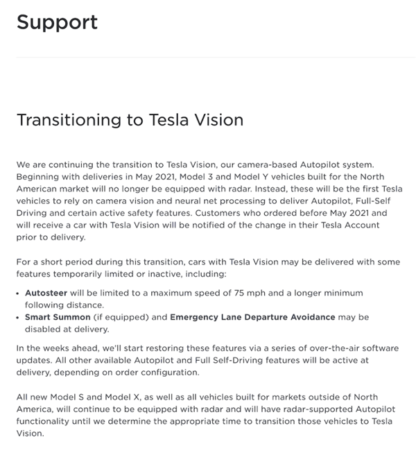 在特斯拉官網的支持頁面上,特斯拉詳細介紹了向純視覺過渡的過程。
