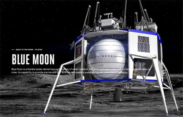 值得注意的是,除了上面提到的載人外太空飛行計劃,藍色起源還有一個重要的長遠計劃——一個名為藍月的登月計劃。 這個計劃最早在2018年被提及,并在2019年正式由貝索斯對外宣布。 整個計劃的終極目標是再次返回月球,并抵達月球南極。