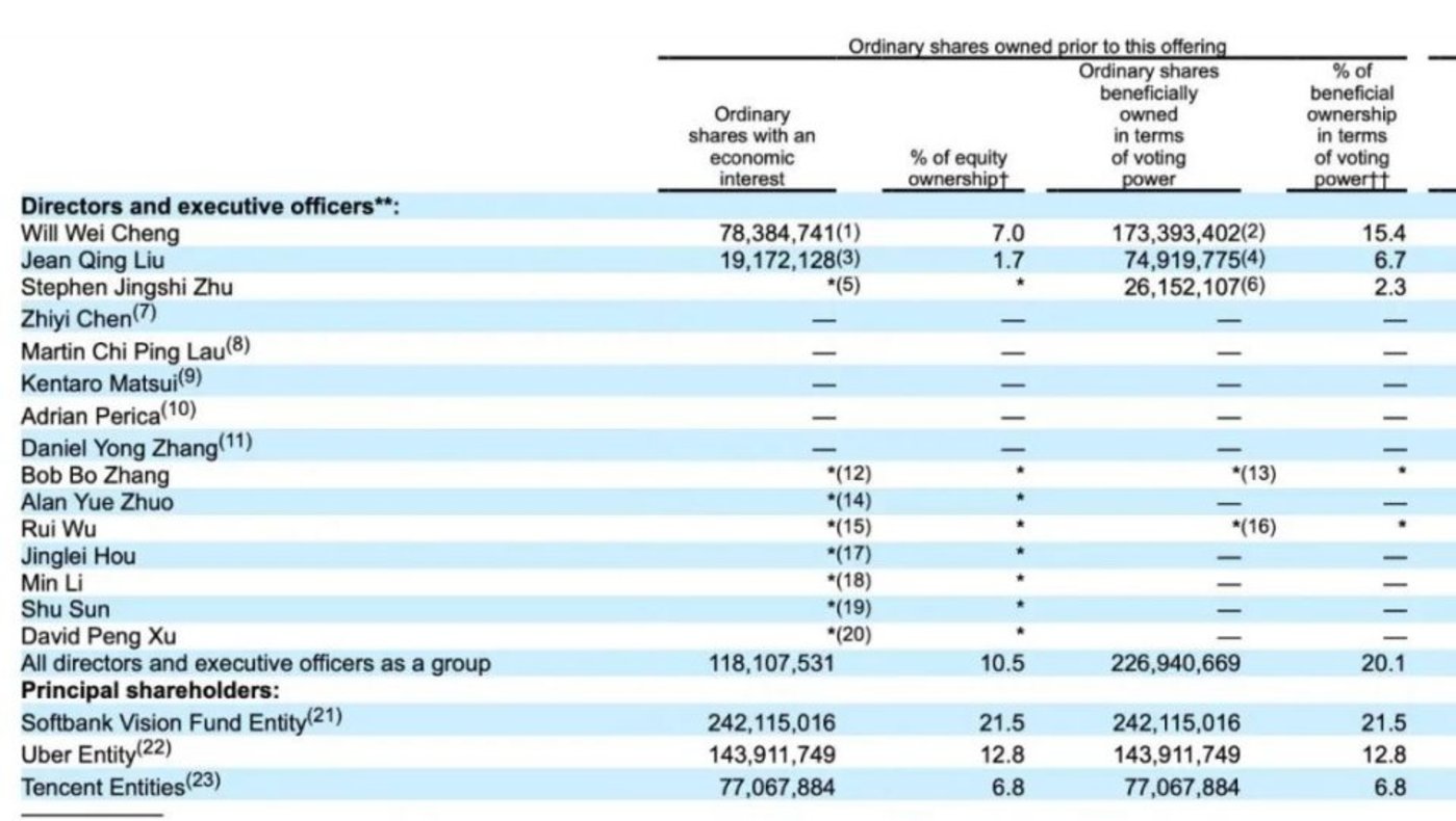 回看滴滴,招股書顯示,最大股東軟銀委派的董事會成員Kentaro Matsui將在滴滴上市時辭任董事,這意味著軟銀將退出滴滴董事會。而滴滴所有董事和高級管理人員持股比例合計10.5%,投票權為20.1%。其中,滴滴創始人、董事長兼CEO程維持有滴滴7%的股權,15.4%的投票權。滴滴聯合創始人、總裁柳青持股1.7%,投票權為6.7%。高級副總裁朱景士持股比例低于1%,投票權為2.3%。