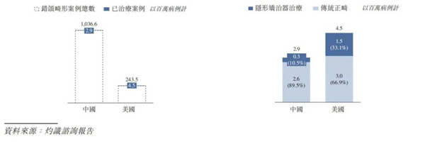 2019年,在中國經治療的2.9百萬例錯頜畸形病例中,僅10.5%采用隱形矯治器治療,而在美國經治療的4.5百萬例錯頜畸形病例中,33.1%采用隱形矯治器治療,其中的差異進一步表明中國隱形矯治市場滲透率較低的事實。