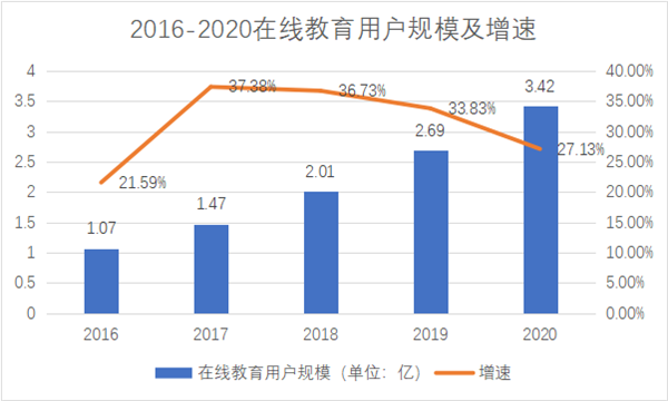 在各個機構大規模儲備彈藥、短兵相接之時,實際用戶拓展的效果并不如人意。據網經社電子商務研究中心聯合網經社教育臺發布《2020年度中國在線教育市場數據報告》顯示,2020年我國在線教育用戶規模達到3.42億人,同比增速27.13%為四年來最低,并且呈逐年下降趨勢。