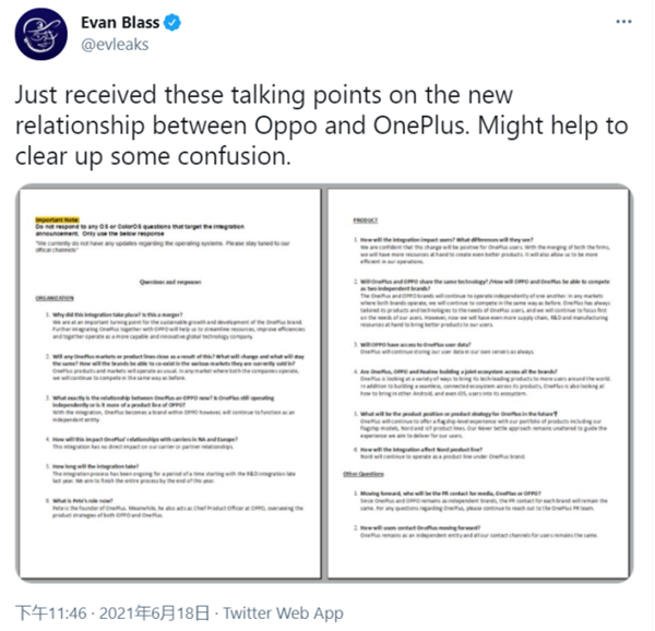 雖然劉作虎在發內部信時明確表示海外用戶仍將使用氧OS系統,但是這些用戶心里還是沒底啊!因為此前曝光海外用戶也將轉入ColorOS。對于此海外爆料大神稱拿到了一加內部文件,文件顯示一加要求員工不要回答用戶任何關于系統的問題。官方要求如果有用戶提問可以回答:我們目前沒有關于操作系統的任何更新。請繼續關注我們的官方頻道