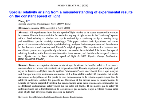 李子豐提供了2008年發(fā)布在物理論文(PHYSICS ESSAYS)期刊上的一篇論文,論文摘要中提到,本文回顧了狹義相對論中時空關(guān)系的基本假設(shè)和觀點;分析了洛倫茲變換和愛因斯坦原著的推導(dǎo)過程和錯誤。建立了相對運動均勻的兩個坐標(biāo)系之間的變換。結(jié)果表明,基于洛倫茲變換的狹義相對論是不正確的,兩物體之間的相對速度可能比光速快。